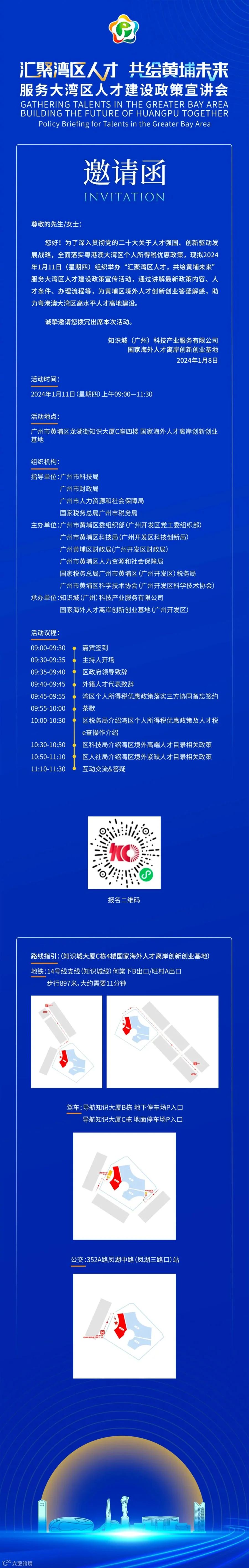 为落实粤港澳大湾区个人所得税优惠政策,现定于2024年1月11日(星期四)上午9:30在国家海外人才离岸创新创业基地(黄埔区龙湖街知识大厦C栋4楼)举办“汇聚湾区人才 共绘黄埔未来”服务大湾区人才建设政策宣讲。如需办理2023年粤港澳大湾区境外高端、紧缺人才个税优惠补贴的企业及个人,可详阅以下图片,扫二维码报名参加。
