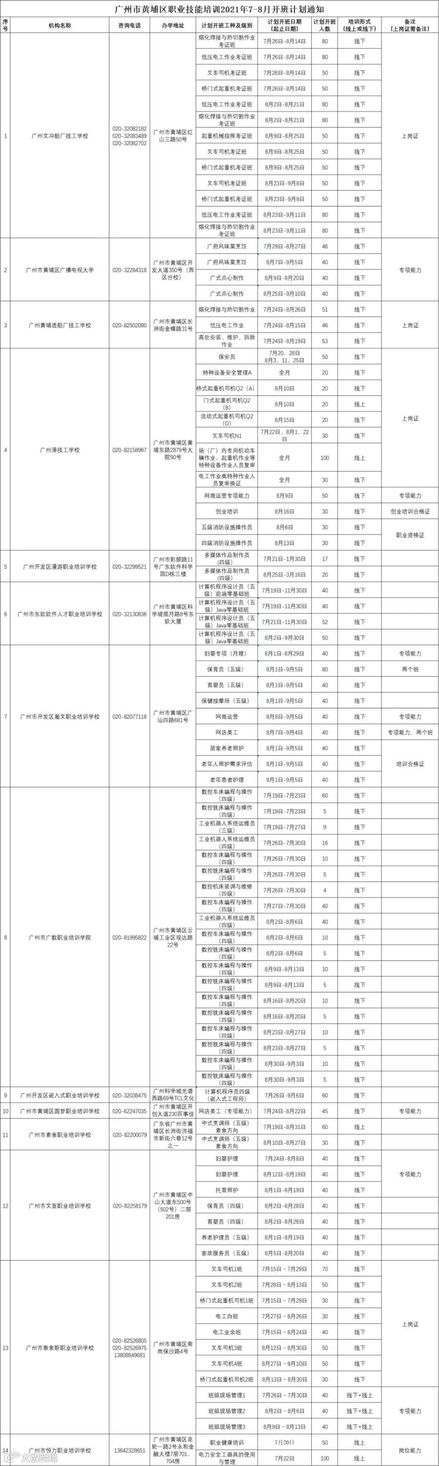广州市黄埔区职业技能培训2021年7-8月开班计划通知