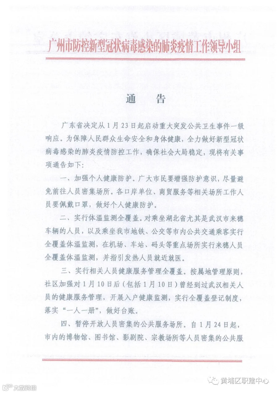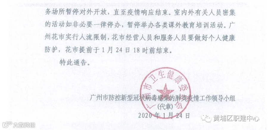 四、暂停开放人员密集的公共服务场所。自1月24日起,市内的博物馆、图书馆、影剧院、宗教场所等人员密集的公共服务场所暂停对外开放,直至疫情响应结束。室内外有关人员密集的活动如非必要一律停办,暂停举办各类课外教育培训活动。广州花市实行人流限制,花市经营人员和服务人员要做好个人健康防护,花市提前于1月24日18时前结束。