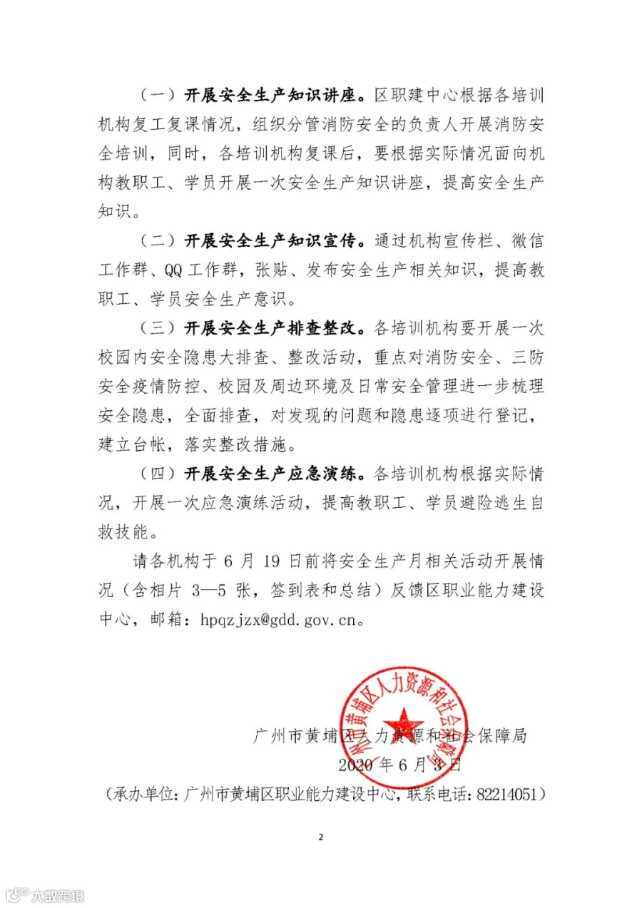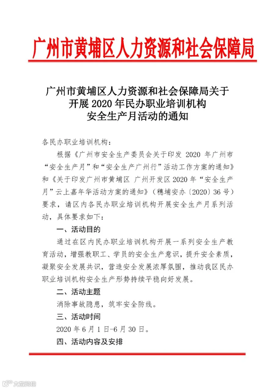 根据《广州市安全生产委员会关于印发2020年广州市“安全生产月”和“安全生产广州行”活动工作方案的通知》和《关于印发广州市黄埔区 广州开发区2020年“安全生产月”云上嘉年华活动方案的通知》(穗埔安办〔2020〕36号)要求,请区内各民办职业培训机构开展安全生产月系列活动,具体要求如下: