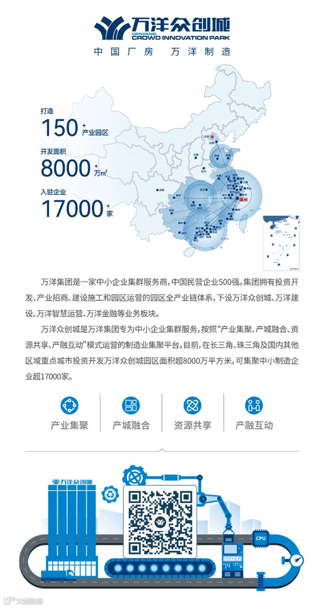 该项目由万洋集团负责投资、开发、建设、统一招商和运营,将打造集生产制造、科技研发、金融服务和智慧园区管理于一体的制造业集聚平台,同时万洋作为中小企业集群高质量发展赋能平台,将通过产业链集聚招商,实现企业高度聚集,实现资源共享。