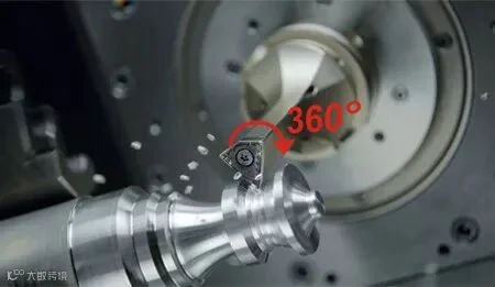 森拉天时通过将FreeTurn刀具安装在铣削主轴上完美实现360°自由车削。随着铣削主轴的旋转,切削刃可根据加工需求灵活变化,轻松应对各个工件的加工需求,所有车削加工都可通过这一把刀具来实现,大大减少了刀具成本和换刀时间。另外,加工过程中主偏角是灵活可调的,也可以适时调整进给,从而确保了优异的切屑控制。