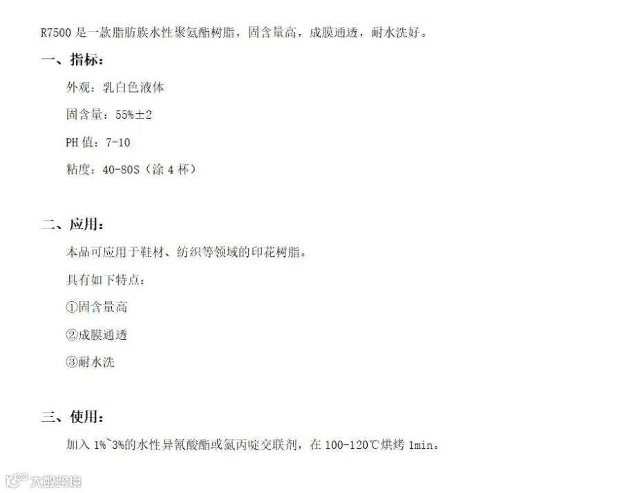 广州市瑞麟新材料有限公司推出的R7500是一款高性能的脂肪族水性聚氨酯树脂,专为鞋材、纺织品等领域的印花应用而设计。其主要特点如下: