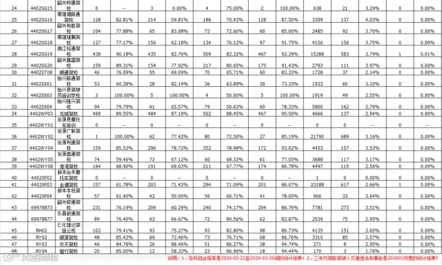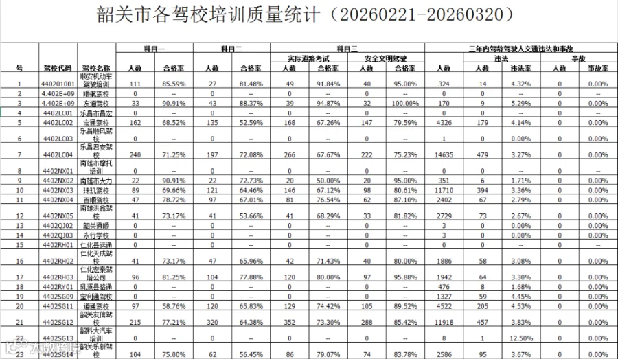 现将3月我市各驾培机构的各科目考试合格率及全市各驾培机构学员取得驾驶证后三年内的交通违法率、交通肇事率情况,通过“韶关交警”微信公众号等渠道向社会公布,同时将情况通报我市交通运输管理部门。