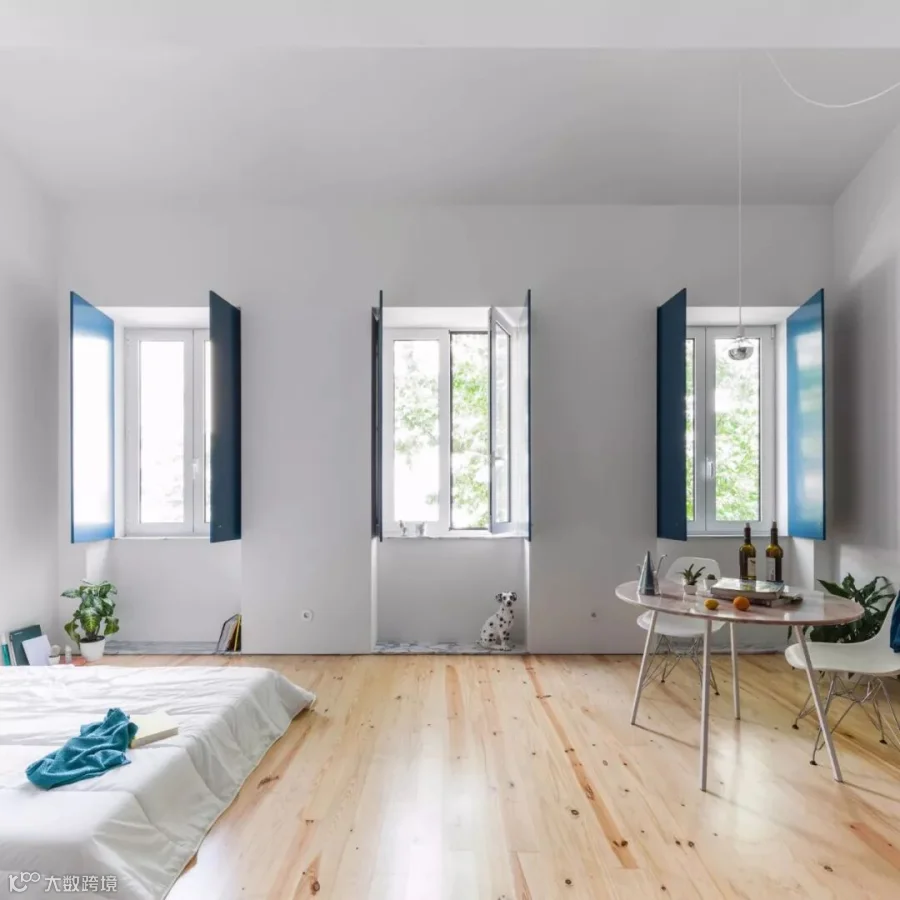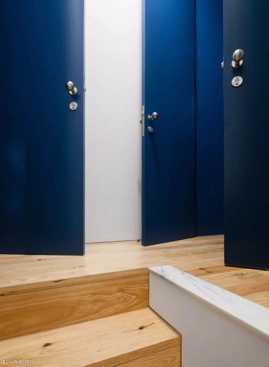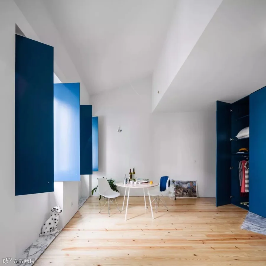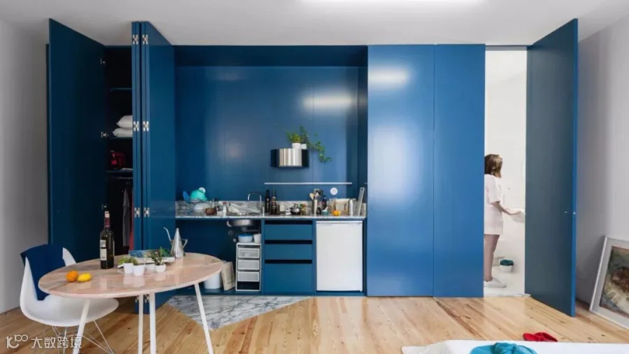 葡萄牙建筑工作室Fala Atelier已将波尔图的一栋旧房子改造成五间工作室公寓,每个房间都配有深蓝色胶合板橱柜,可用于隐藏或露出厨房,浴室,储物柜和窗户。这有助于在单间公寓中营造整洁的外观。