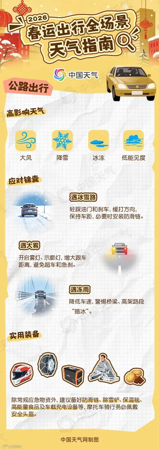 2、春运中、后期冷空气活动频繁,易出现低温阴雨天气,高寒山区局部路段可能出现道路结冰,需防范低温阴雨及低能见度、道路湿滑等对春运交通的不利影响。