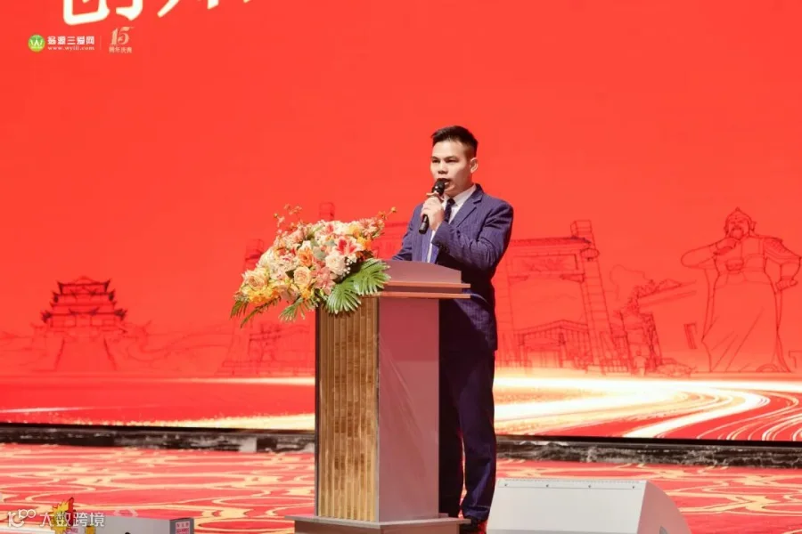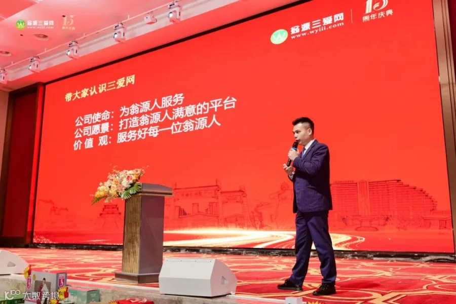庆典正式开场,三爱网创始人陈总首先为活动致开幕词。他回顾了公司十五年来的发展历程,感恩每一位伙伴的信任与陪伴,并阐述了始终秉持的“有爱、互爱、大爱”的三爱精神。