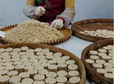 翁源客家米饼是一种以大米、花生、芝麻、冰片糖制作的客家传统饼食小吃,常作为客家人的日常零食、节日礼品或喜饼,其制作技艺流传于翁源县各镇。