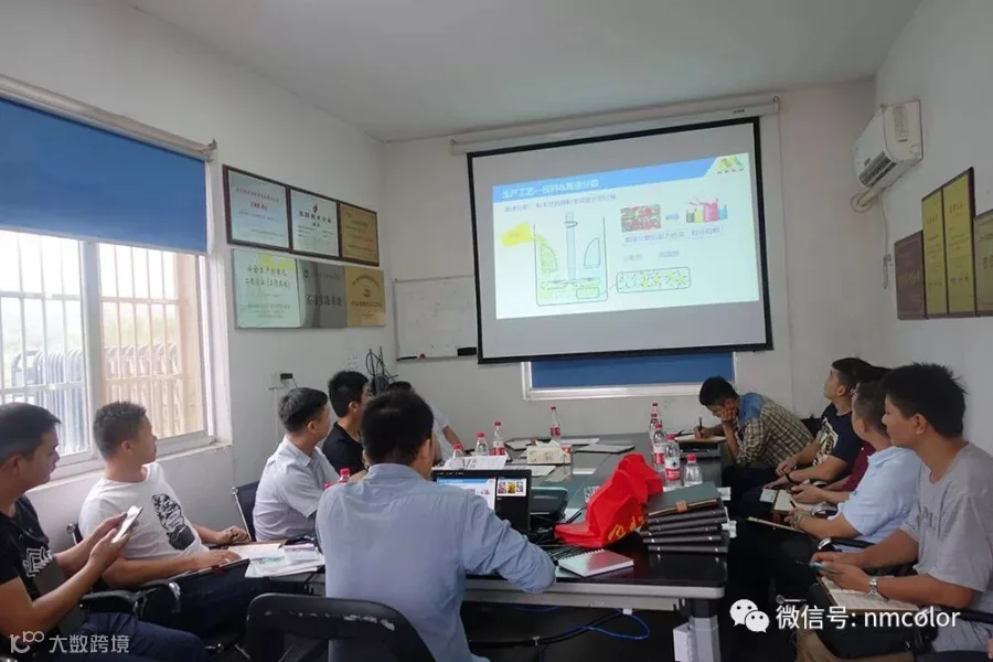 生产中心张博带领大家参观了车间,给大家介绍了我们的生产设备,车间的自动生产线,原材料使用情况,以及生产安排状况。之后张博还介绍了色浆的生产及质量管控。
