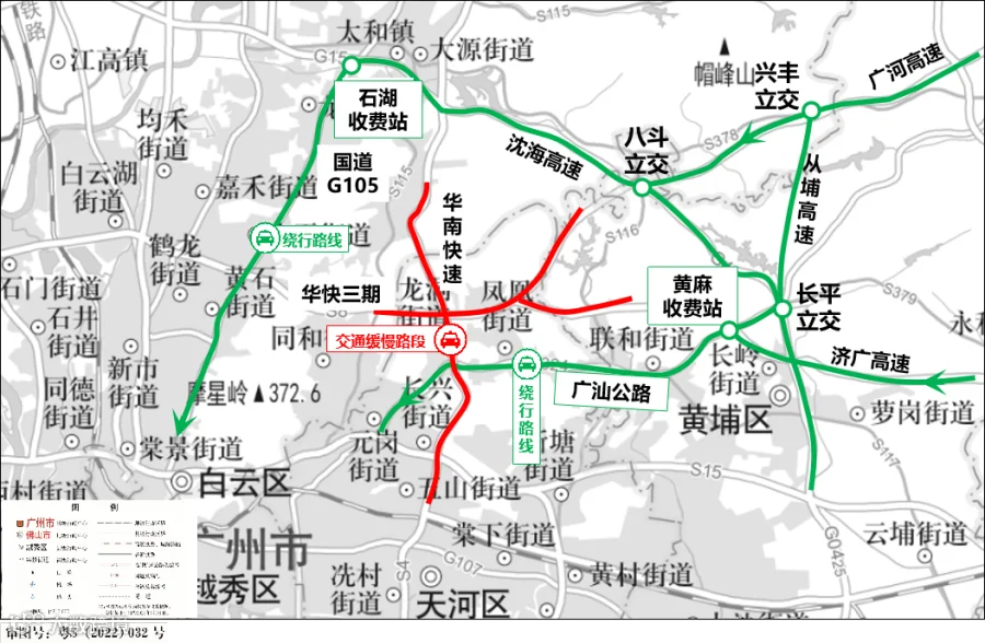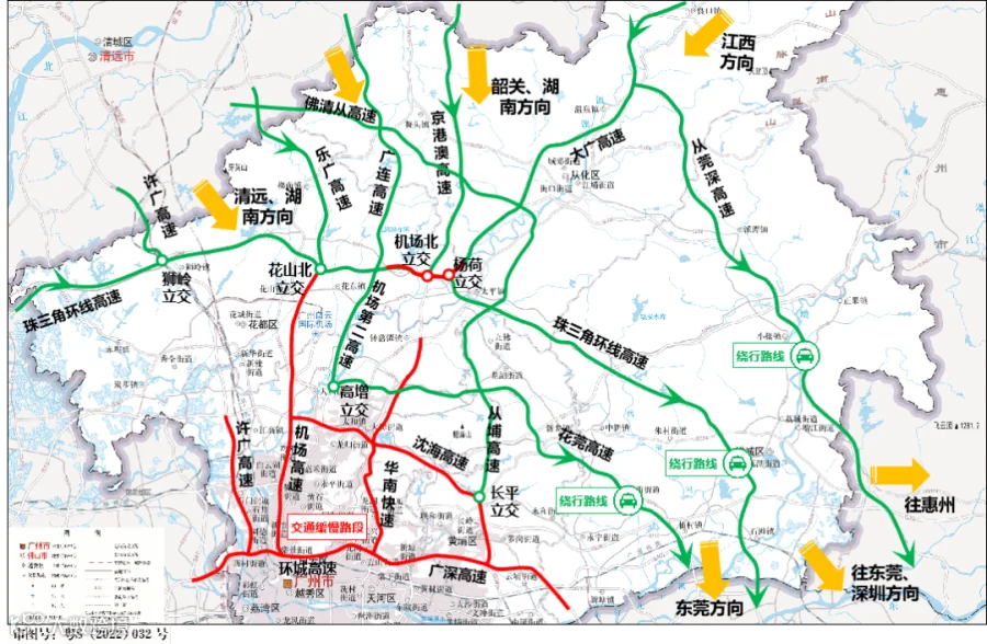 清远、湖南方向来车,可经许广高速衔接珠三角环线高速绕行,避开机场高速、北环高速等红色缓行路段;韶关、江西方向来车,建议通过京港澳高速、大广高速通行,依托花山北立交、机场北立交等枢纽转换。