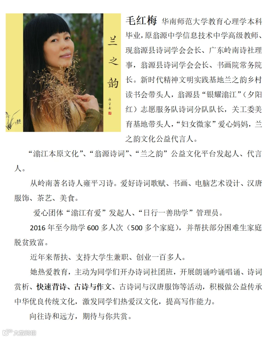毛红梅(华师教育心理学本科 / 原翁源中学信息技术中学高级教师 / 诗词学会会长 / 广东岭南诗社理事 / 公益辅导名师 / 新时代精神文明实践基地骨干 / 兰之韵乡村读书会带头人 / 妇女微家爱心妈妈 / 关工委兰之韵美育基地带头人 / 银耀滃江夕阳红志愿服务队诗词分队带头人):免费主讲综合素养、作文、信息素养、体育与成长辅导课程 -