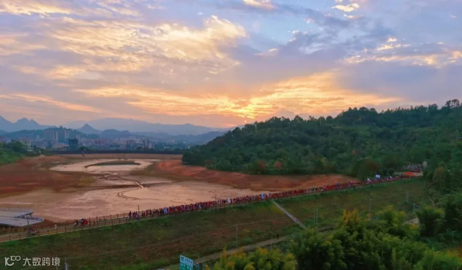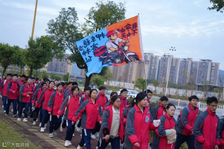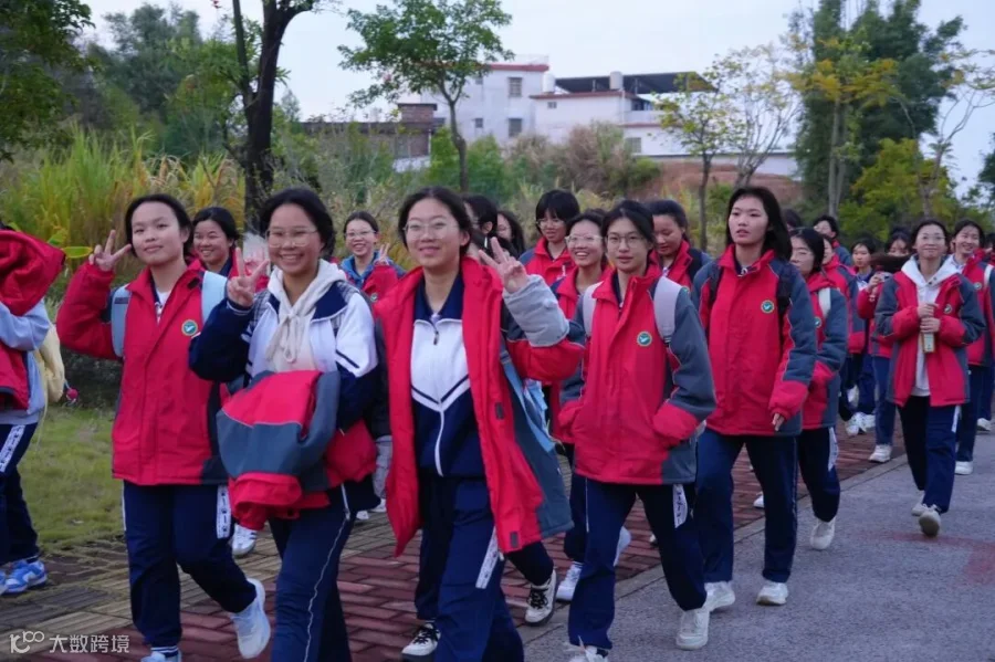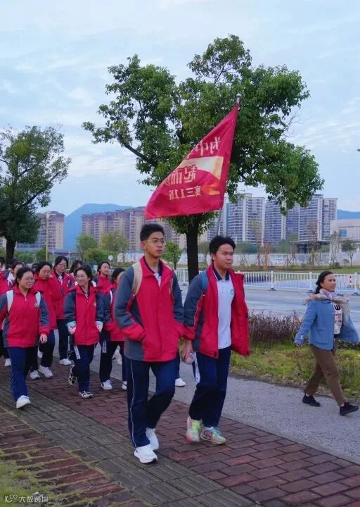八泉公园山门前,学子们的呐喊,如龙吟震彻云霄,似凤舞奔赴山海;水库堤坝上,整齐的队伍化作一道红色长城,成为晨光中最动人的风景。