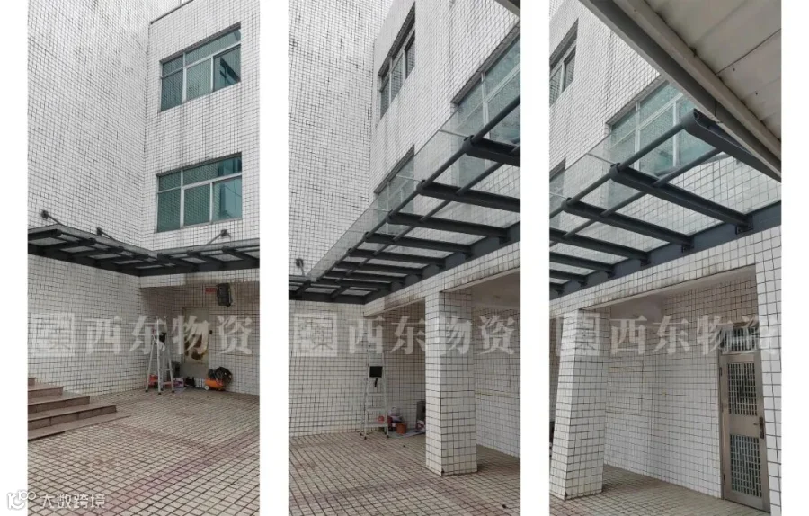 覆盖材料选型:医院、学校优先选FRP采光板(透光性好,防火等级达B1级,耐老化)或夹胶钢化玻璃(安全防坠落);公交站台可选用彩钢瓦(性价比高,易维护)或耐力板(抗冲击,适合人流密集区域)。