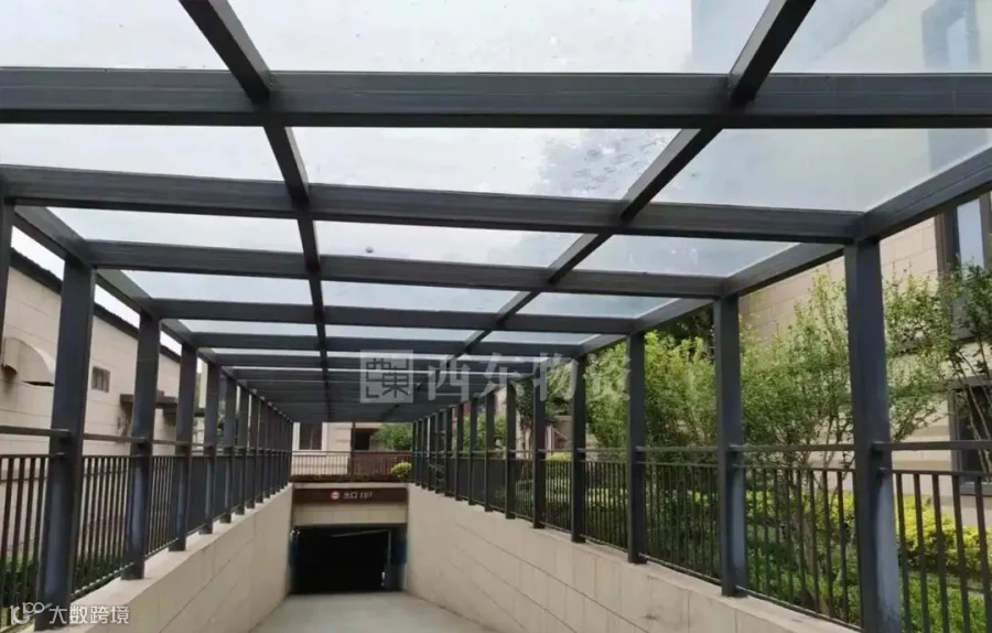 覆盖材料选型:优先选聚碳酸酯阳光板(透光率80%以上,抗冲击、耐紫外线,重量仅为玻璃的1/12,适合露台、庭院);车库入口可选用夹胶钢化玻璃(透光性好、安全性高,破碎后不飞溅)或彩钢瓦(性价比高,适合对透光无要求的场景)。