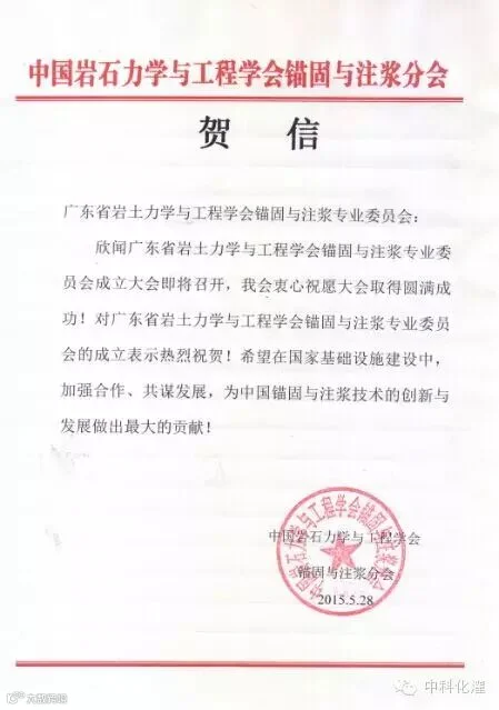 中国岩石力学与工程学会锚固与注浆专业委员会、中国水利学会化学灌浆分会、中国土木工程学会土力学与岩土工程分会地基处理专业委员会向大会发来了贺信、贺电表示祝贺。