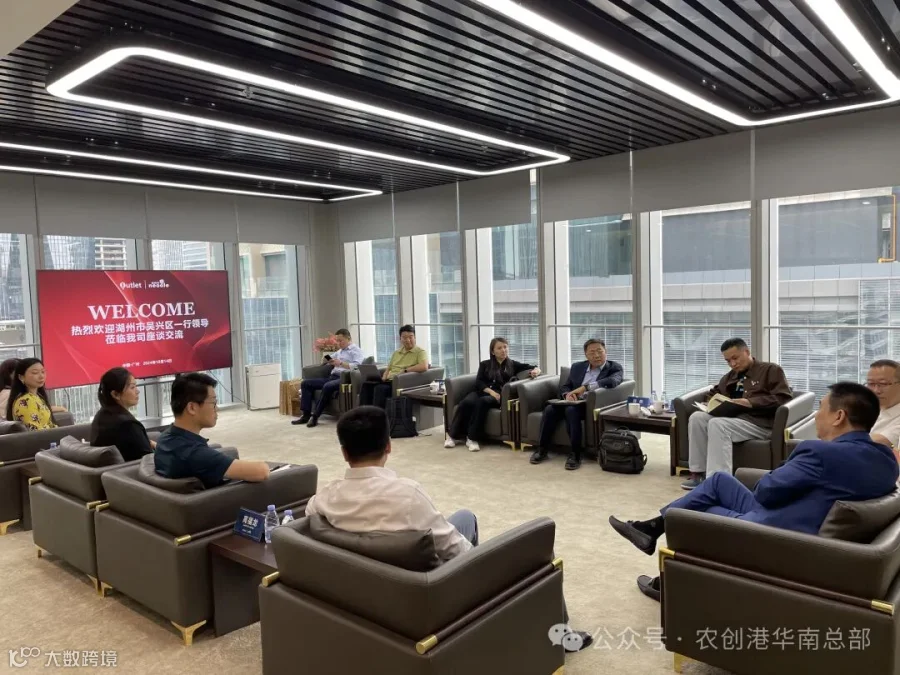 2024 年 10 月 14 日,浙江省湖州市吴兴区费屹巍区委常委、副区长一行莅临中国奥莱集团和中国农创港跨境电商产业园华南总部进行实地考察。中国奥莱集团董事局主席林卓延和中国农创港董事长吴全东等进行陪同。