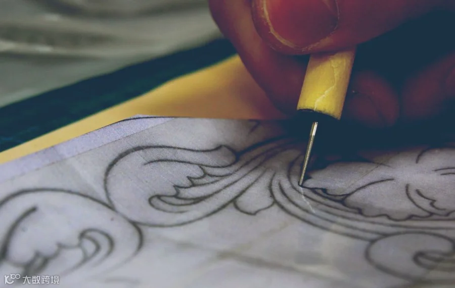 3.描图 (将图案纹样运用圆头铁笔依图案纹样线条,转绘到湿润的皮革上。先描出其轮廓,再描绘其他细部图样,运笔要坚定、有力)