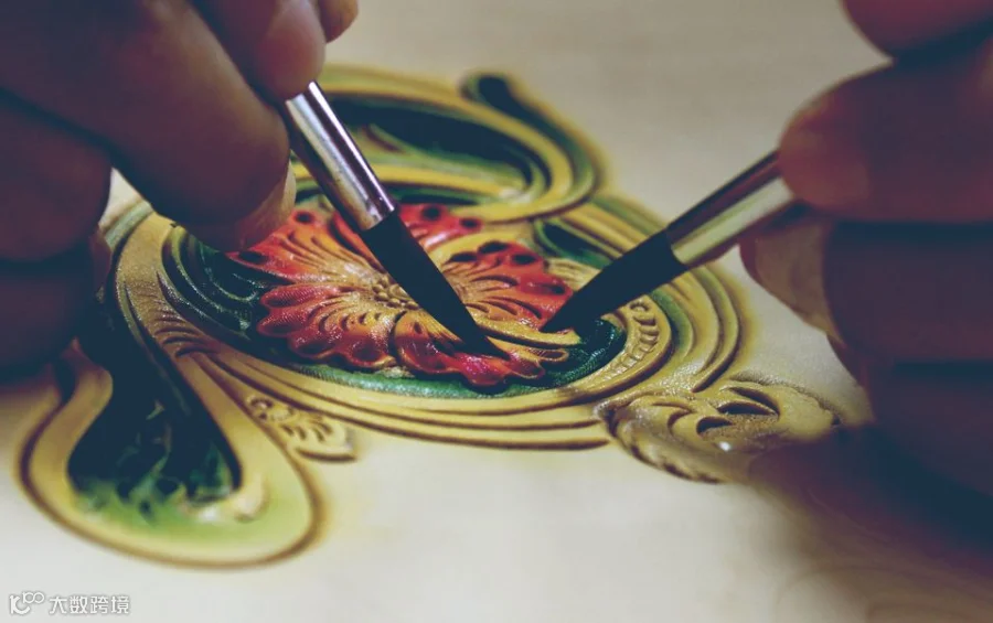 6.染色 (依设计选用染色方法,使图案纹样栩栩如生。常见的皮革染色法有油染法、糊染法、防染法、水晶染法、干擦法、蜡染法、压克力染等)