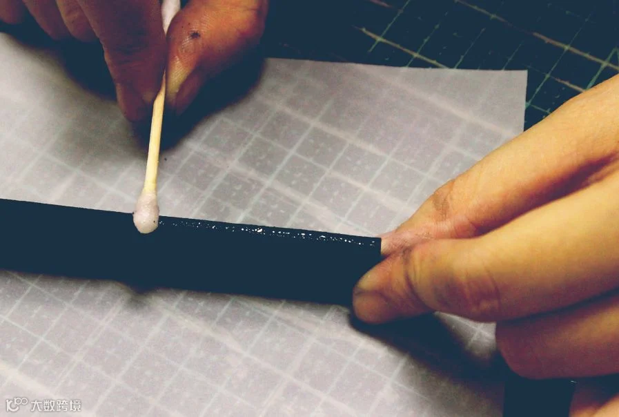 7.磨边 (待图案雕刻、染色完成后,确认无尘埃附着后,进行磨边在皮革表面擦拭)