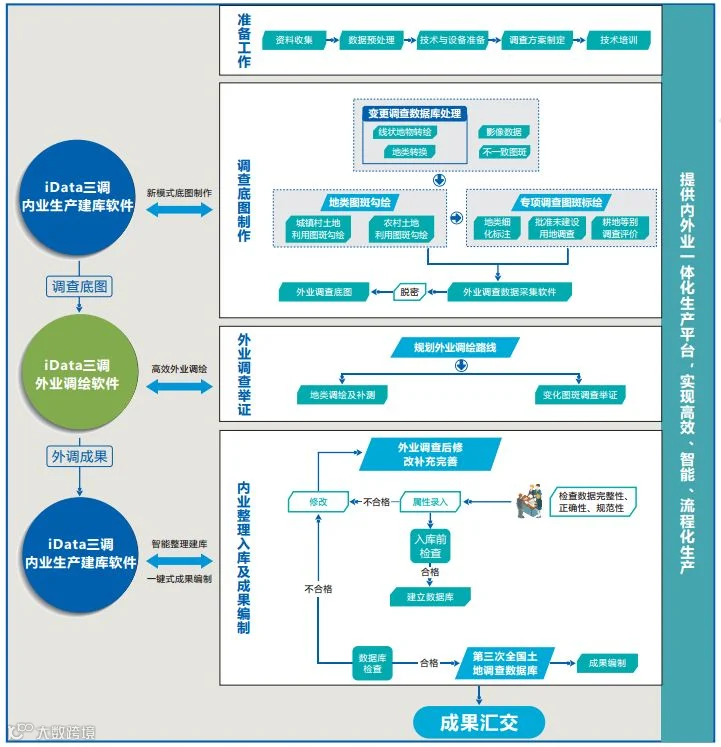 南方三调内外业一体化方案由基于iData数据工厂定制的iData三调外业调绘软件、iData三调内业生产建库软件构成,实现跨平台内外业一体化,为县级“三调”生产作业实现全流程服务。