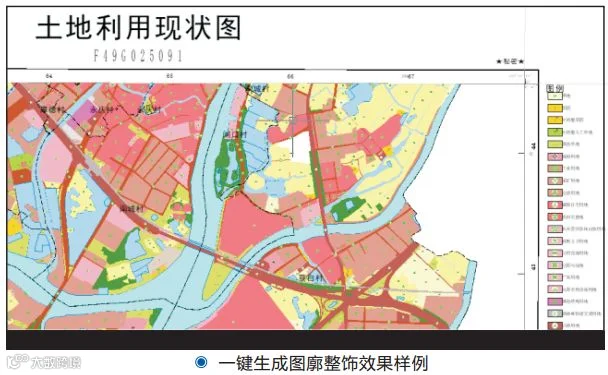一键生成图廓整饰内容:根据已设置好的图廓整饰配置,一键自动生成图廓整饰内容,包括图例、格网十字丝、图名、坐标标注等。