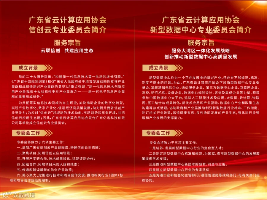 2023年3月17日下午,由广东省云计算应用协会、广东智慧城市产业技术创新联盟主办,广东亿迅科技有限公司、公诚管理咨询有限公司、广州宽带主干网络有限公司、金地威新黄埔科创园协办的,以“云数网合、共建生态”为主题的“2023广东云计算产业高质量发展峰会暨新型数据中心专委会与信创云专委会成立大会”在广州市黄埔区顺利举办。此次峰会给我们带来新的行业见解、共识——“信创云”与“新型数据中心”是推动云计算产业高质量发展两大着力点。