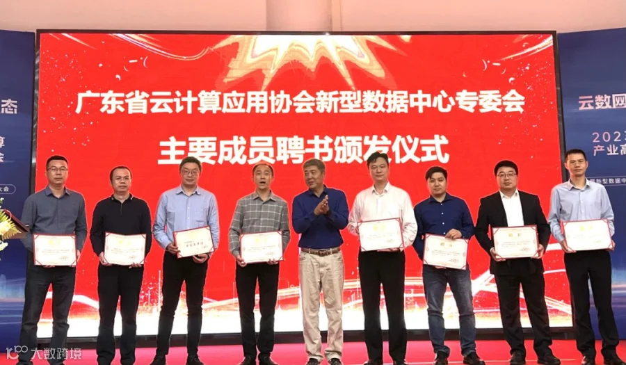 ▲广东省工业和信息化厅原二级巡视员曾强(居中者)为新型数据中心专业委员会首批主要成员颁发聘书