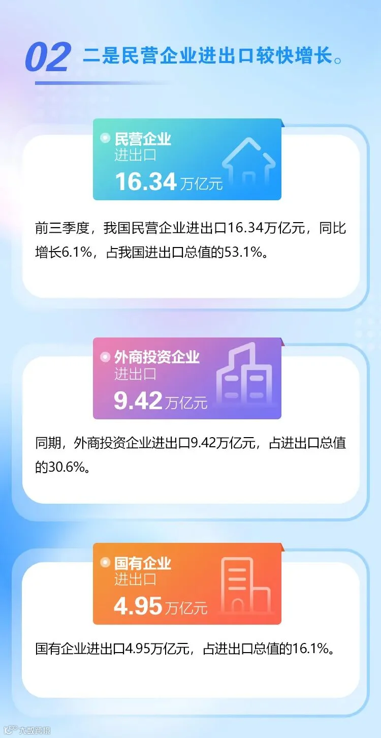 谢谢您的提问。民营企业已成为推动中国式现代化的生力军,高质量发展不可或缺的重要基础,在稳增长、促就业、改善民生等方面,都发挥了积极作用。在外贸领域,前三季度,我国民营企业进出口增长6.1%,明显优于整体,是稳规模、优结构的中坚力量。具体来看: