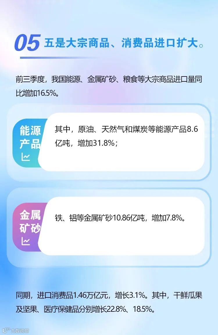二是进口数量稳步增加,保供稳链作用持续发挥。我国进口数量已经连续8个月同比增加,前三季度累计增加2.6%。尤其是满足国内生产需要的资源能源产品、关键零部件等进口数量稳步扩大,比如原油、天然气、金属矿砂等进口数量分别增加14.6%、8.2%、7.8%;电脑的中央处理部件、航空器零部件等进口数量也分别增加42.9%、15.9%。