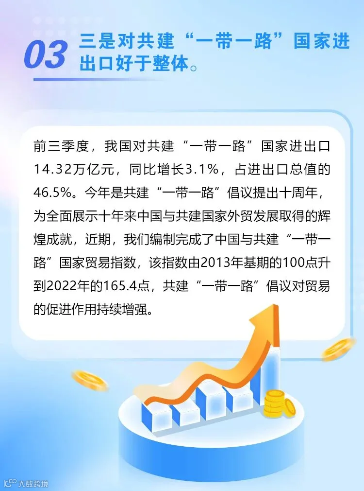 谢谢您的提问。共建“一带一路”倡议提出以来,我国与共建国家互联互通水平大幅提升,对外贸易、跨境物流也更加便捷,国内国际合作更高效,推动了产业合作水平不断提升,产业合作领域也不断拓宽,贸易往来更加频繁,所以我国与共建国家的贸易实现了稳定的增长。前三季度,我国对共建“一带一路”国家的进出口14.32万亿元,增长了3.1%,占我国进出口总值的比重继续提高,达到了46.5%。