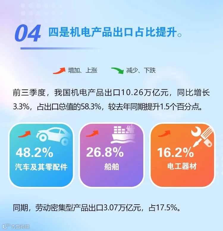 二是产业优势巩固。船舶、工程机械、家电等优势出口产业,市场占有率、国际竞争力和品牌影响力等进一步提升。同时,消费电子产业进出口呈现了复苏的势头,集成电路进出口在8、9月连续环比回升,9月手机、电脑出口同比降幅明显收窄。