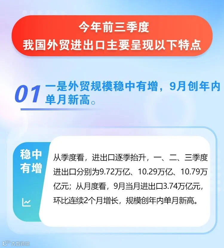 今年前三季度,面对复杂严峻的外部环境和国内多重困难挑战,在以习近平同志为核心的党中央坚强领导下,我国坚持稳中求进工作总基调,经济整体回升向好,高质量发展扎实推进,货物贸易进出口平稳运行、积极向好。