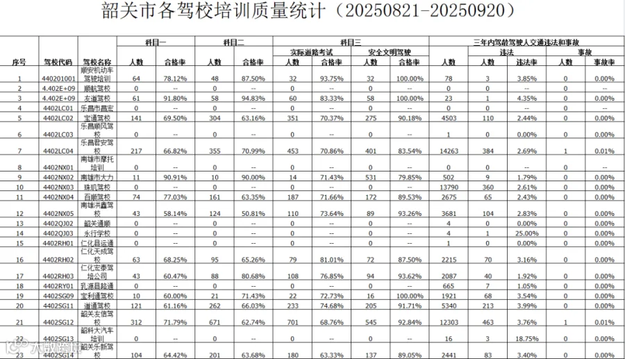 现将本月我市各驾培机构的各科目考试合格率及全市各驾培机构学员取得驾驶证后三年内的交通违法率、交通肇事率情况,通过“韶关交警”微信公众号等渠道向社会公布,同时将情况通报我市交通运输管理部门。