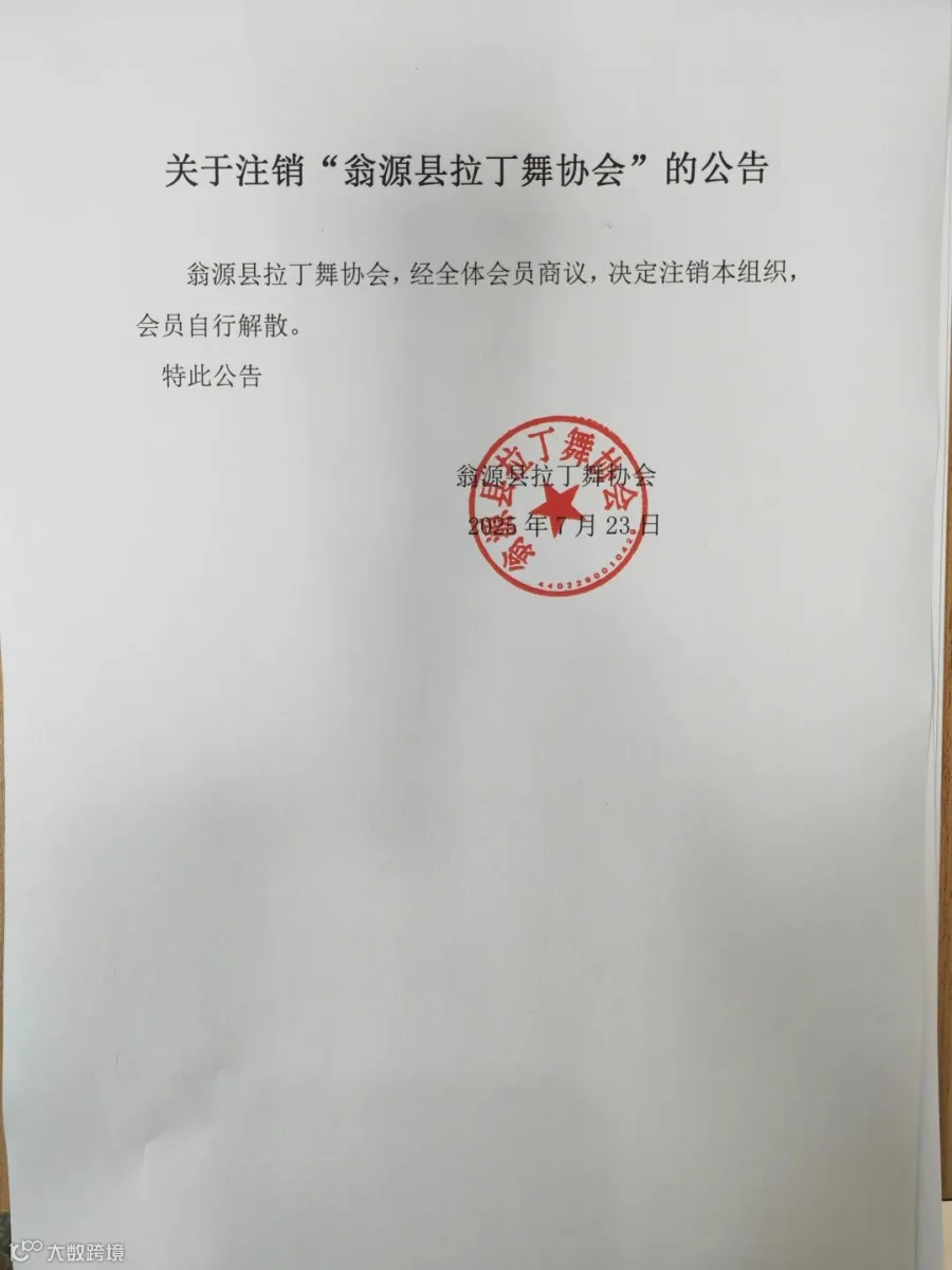 翁源县拉丁舞协会,经全体会员商议,决定注销本组织,会员自行解散。