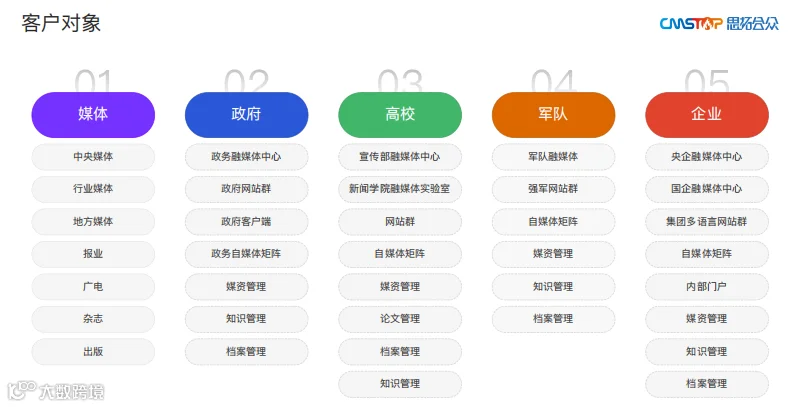 思拓拥有强大的产品研发能力和完善的技术服务体系,已服务媒体、政府、军队、高校和集团企业等客户600多家。思拓提供自主知识产权软件产品,广泛应用于融媒体、媒资管理、内容管理、内容发布、手机新闻客户端、手机采编客户端、多租户网站群、数据大屏、知识管理和数字资产管理等业务需求场景。