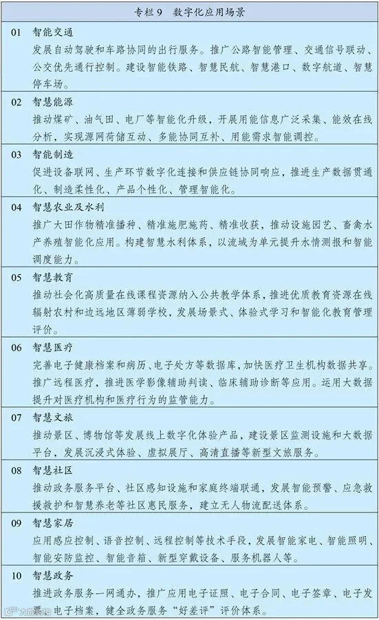 实施“上云用数赋智”行动,推动数据赋能全产业链协同转型。在重点行业和区域建设若干国际水准的工业互联网平台和数字化转型促进中心,深化研发设计、生产制造、经营管理、市场服务等环节的数字化应用,培育发展个性定制、柔性制造等新模式,加快产业园区数字化改造。深入推进服务业数字化转型,培育众包设计、智慧物流、新零售等新增长点。加快发展智慧农业,推进农业生产经营和管理服务数字化改造。