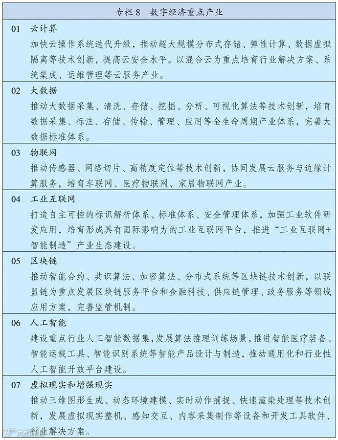 培育壮大人工智能、大数据、区块链、云计算、网络安全等新兴数字产业,提升通信设备、核心电子元器件、关键软件等产业水平。构建基于5G的应用场景和产业生态,在智能交通、智慧物流、智慧能源、智慧医疗等重点领域开展试点示范。鼓励企业开放搜索、电商、社交等数据,发展第三方大数据服务产业。促进共享经济、平台经济健康发展。