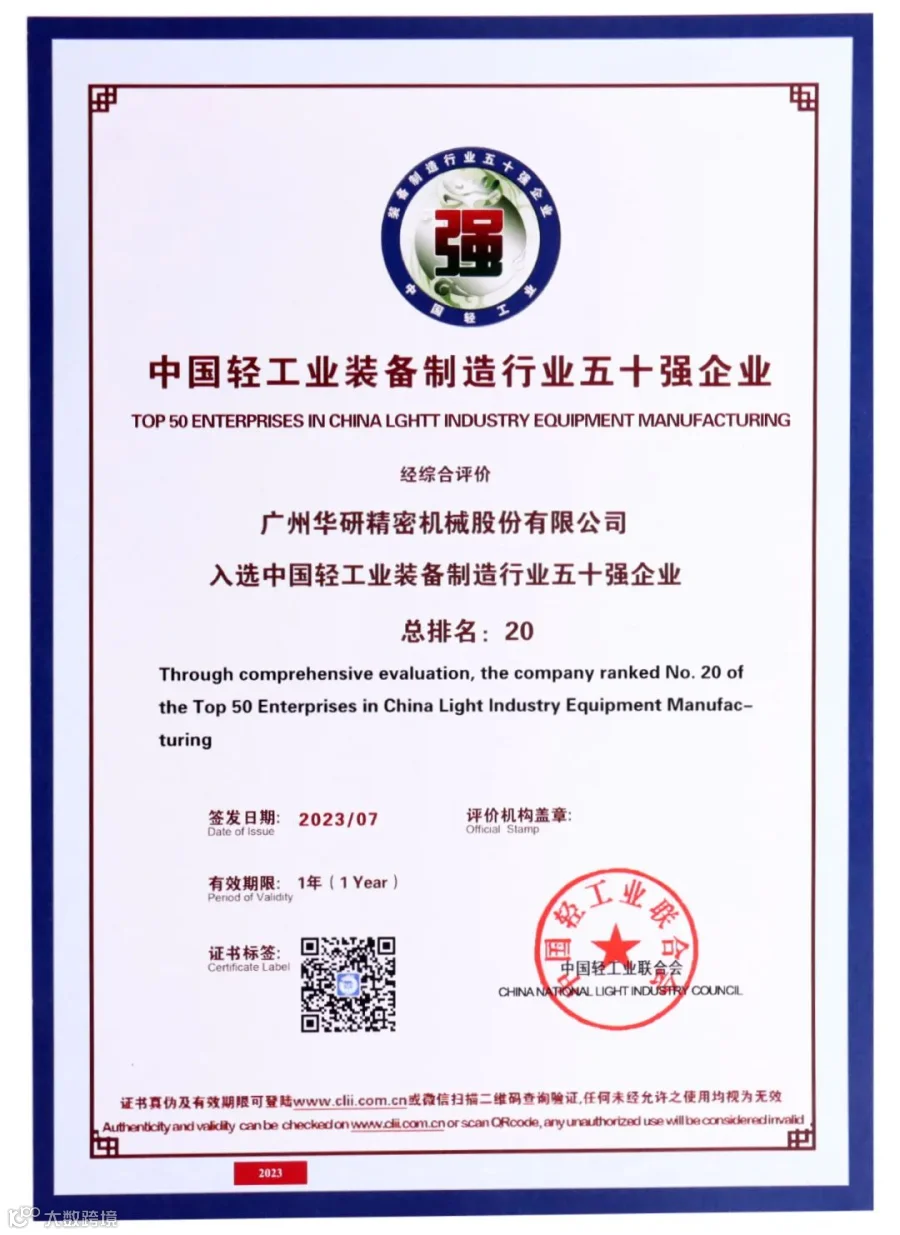 2023中国轻工业百强企业高峰论坛于7月20日在京举行。会上发布了中国轻工业装备制造行业五十强企业名单。根据综合评价结果,广州华研精密机械股份有限公司入选“中国轻工业装备制造行业五十强企业”,位列第20名。