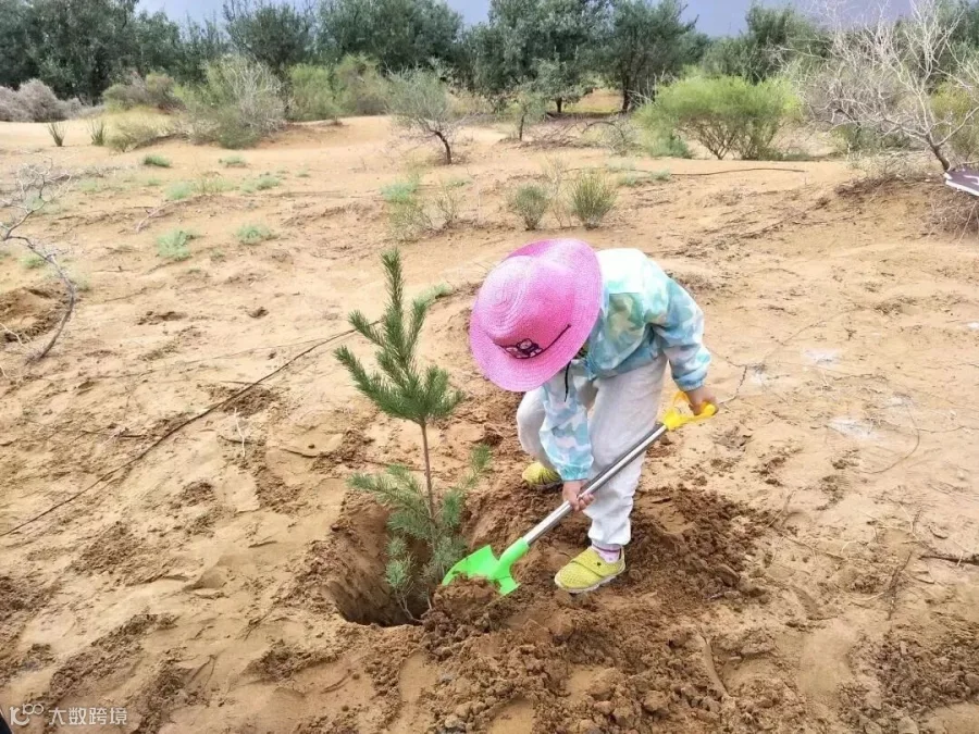 与家人播种小树苗,为植树环保贡献力量,让孩子从小培养小小环保卫士的思维和担当。也许不久后的将来,这里会像毛素乌一样,从沙漠变绿洲,到时候,便可以自豪地说,这大片的绿色,也有我的一份力量。