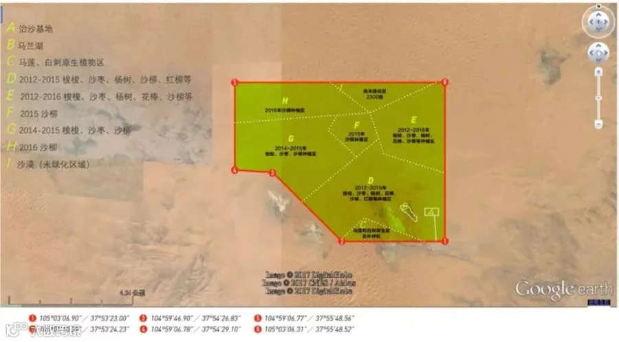 马兰湖公益治沙项目所处的栾井滩生态移民区,干旱少雨。风大沙多,年均降水量147毫米,蒸发量近3000毫米以上,水资源短缺,生态环境极为脆弱,沙漠化严重。从2011年开始,从“零碎碎打”的治沙模式,到现在规模化、工程化的治沙造林。20平方千米的沙漠几乎全部种上了植被,种植植物总体成活率达到70%。