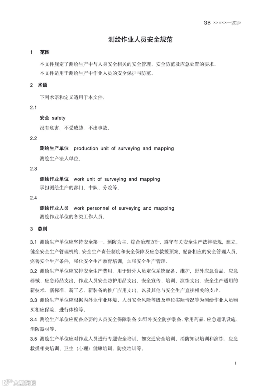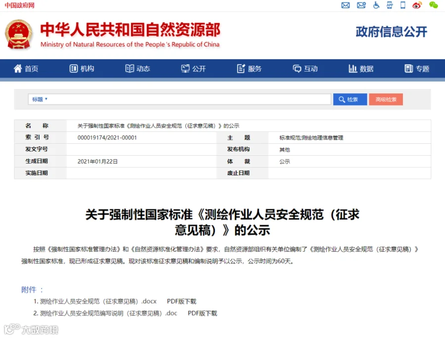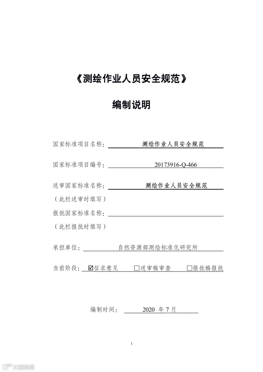 自然资源部近日发布了关于强制性国家标准《测绘作业人员安全规范(征求意见稿)》的公示,内容如下:
