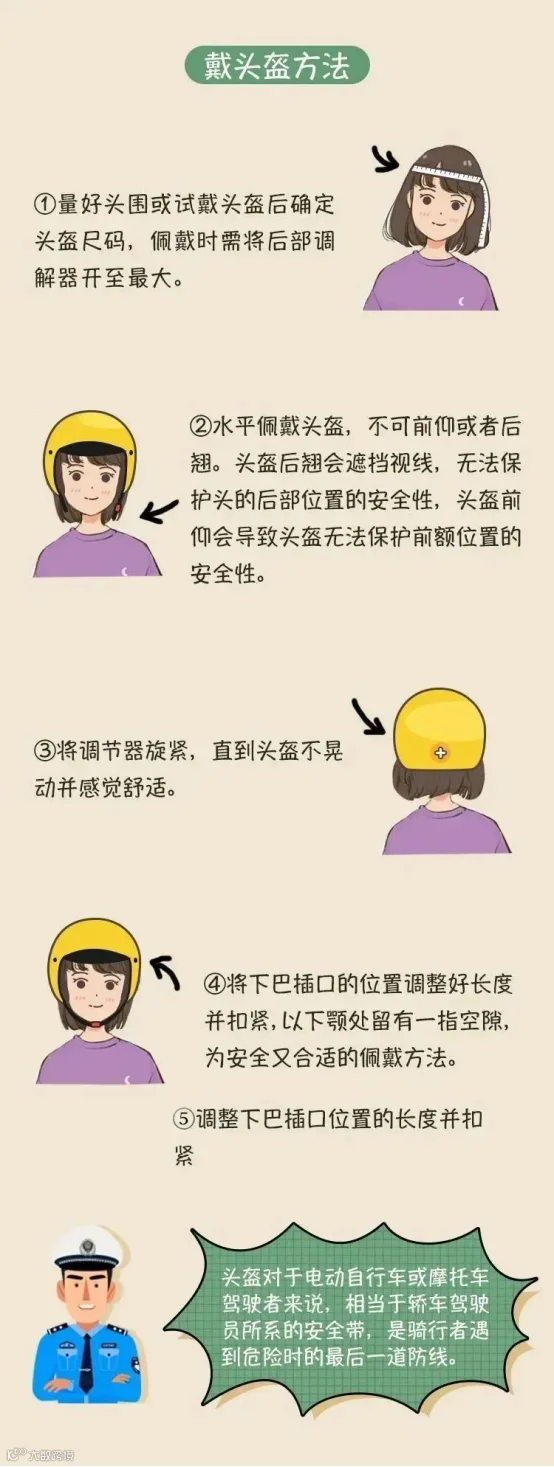 驾乘电动自行车若不佩戴安全头盔,头部将无法获得有效保护,发生事故后头部会与地面、护栏等坚硬物体发生碰撞,无异于以卵击石。因此,佩戴头盔是安全骑行的必要保护措施,骑乘人员需要正确佩戴安全头盔,以保护头部,降低事故伤害程度。
