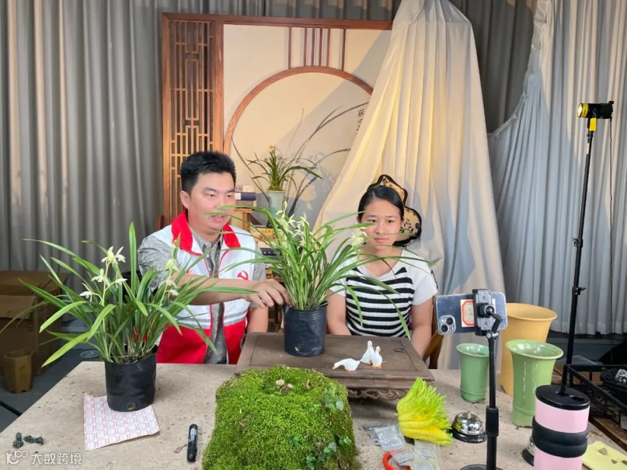 图为江尾镇松岗村邻长丘南方正在帮助村民直播销售兰花。