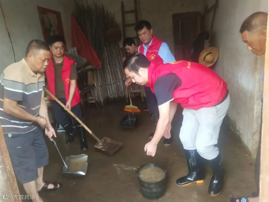图为周陂镇哈水村邻长徐福志协调党员帮助受水浸村民清理家中淤泥。