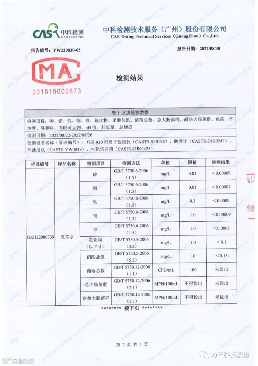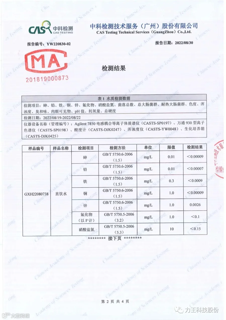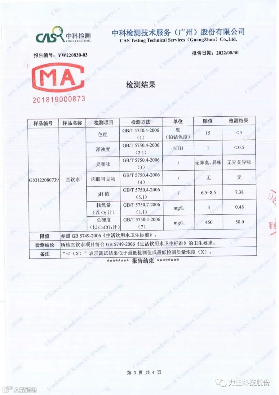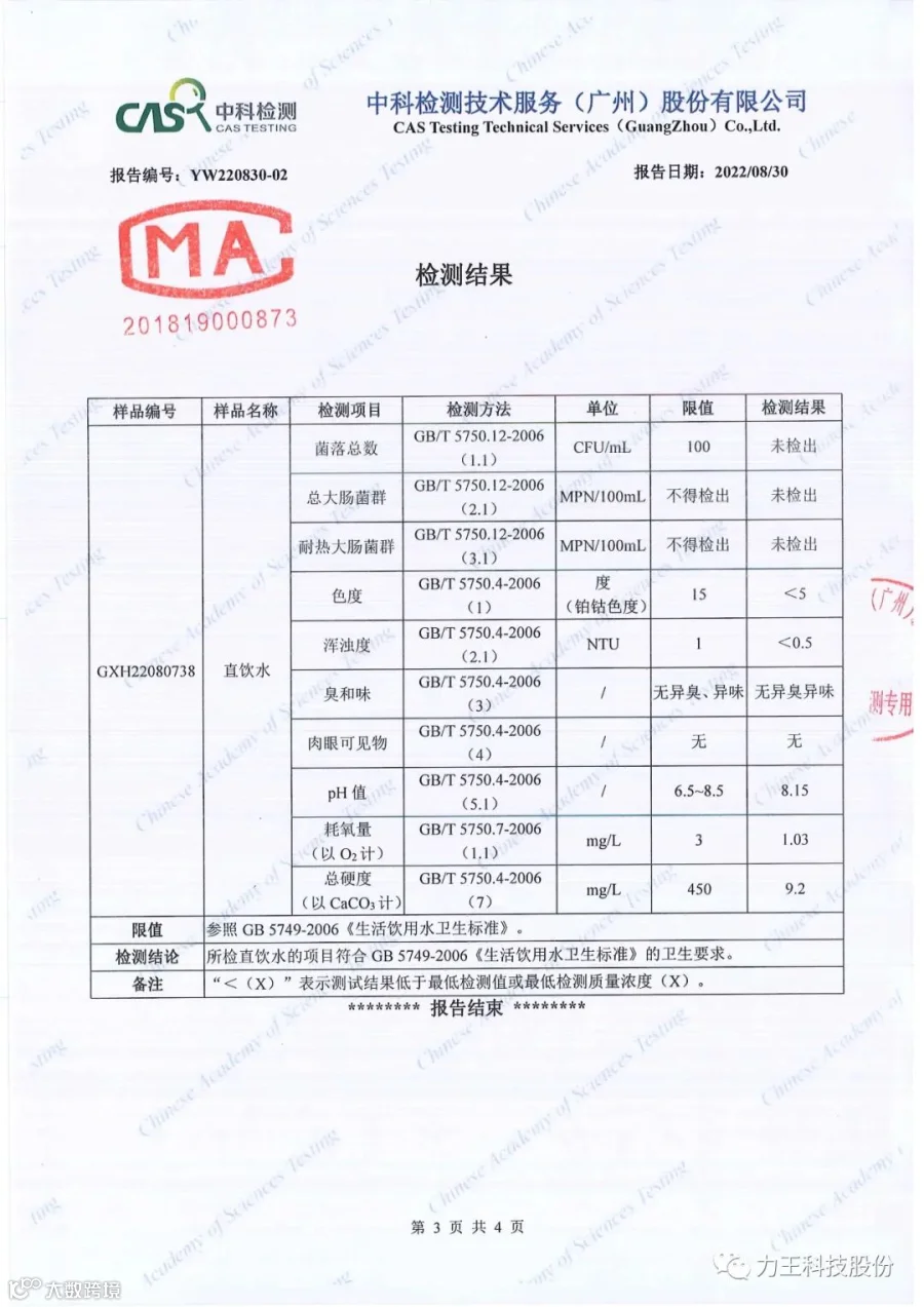 广州卫生职业技术学院饮用水水质检测报告 力王科技股份