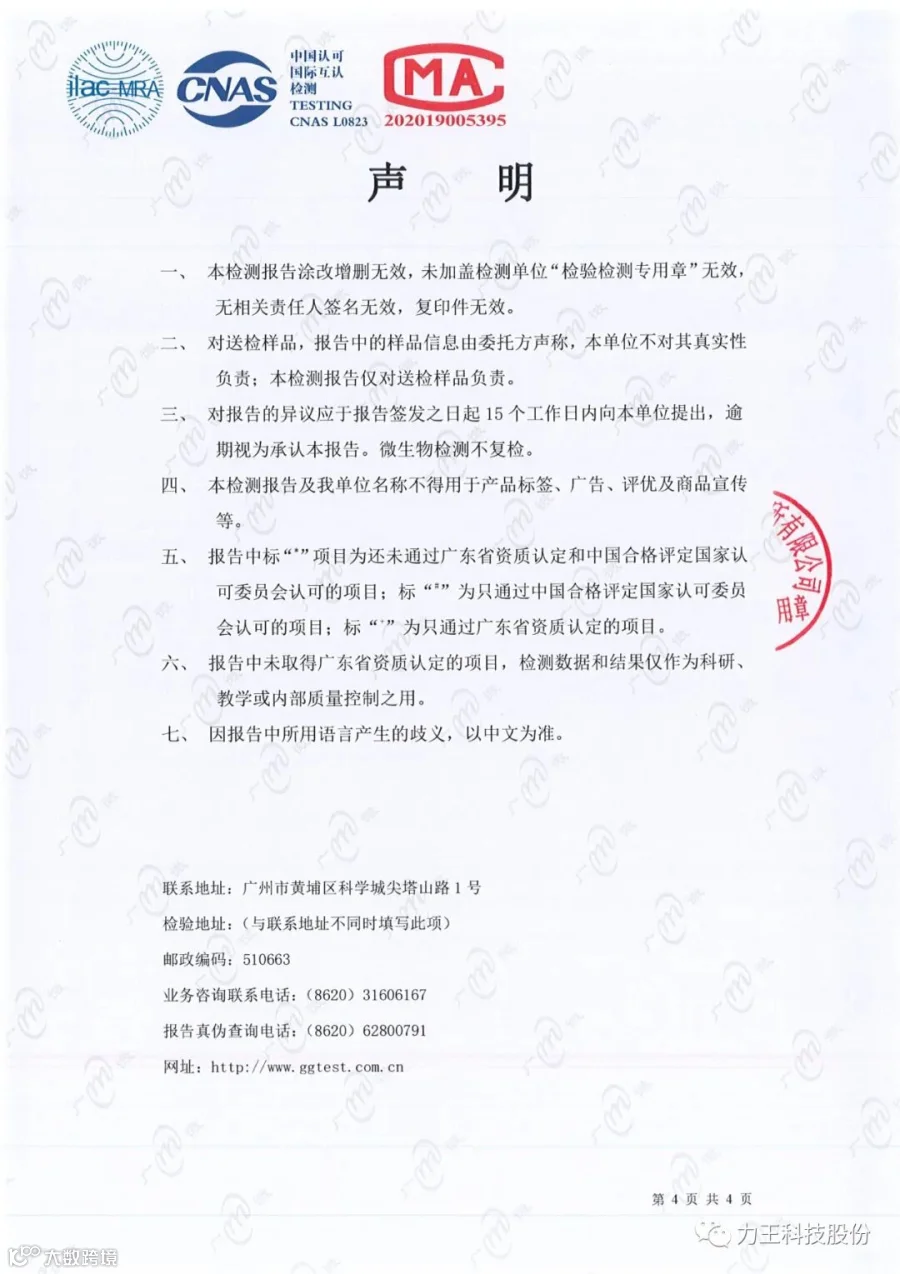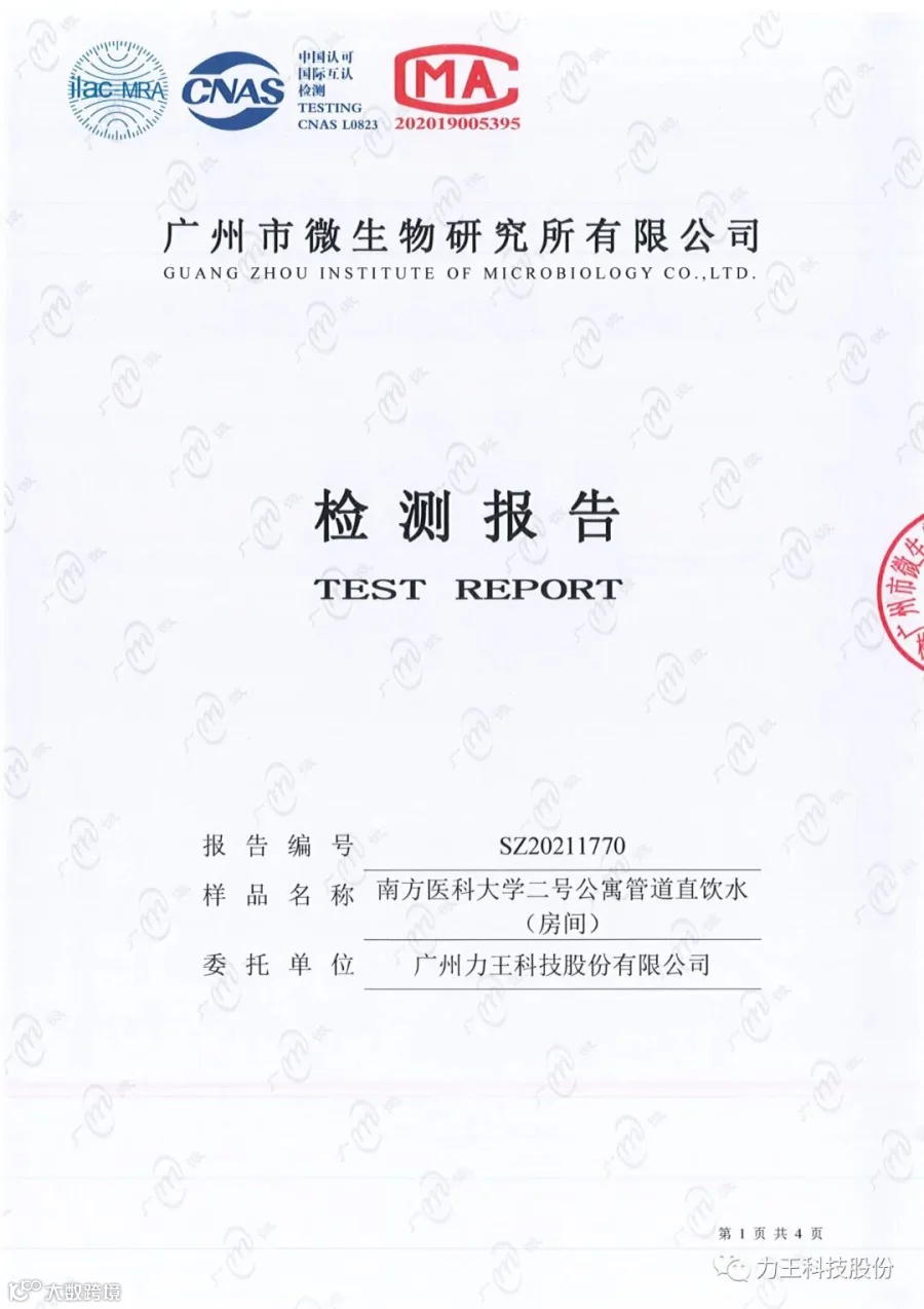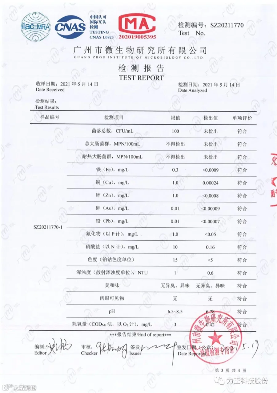 力王科技股份近日南方医科大学2号公寓管道直饮水项目竣工,项目组委托广州力王科技股份有限公司将机房取水样本送往广州市微生物研究所有限公司依据GB/T5750-2006《生活饮用水标准检验方法》对进行检验,检测项目包括菌落总数、总大肠菌群、耐热大肠菌群、铁、铜、锌、砷、铅、氟化物、硝酸盐氮、色度、浑浊度、臭和味、肉眼可见物、pH、耗氧量。限值参考CJ 94-2005《饮用净水水质标准》。