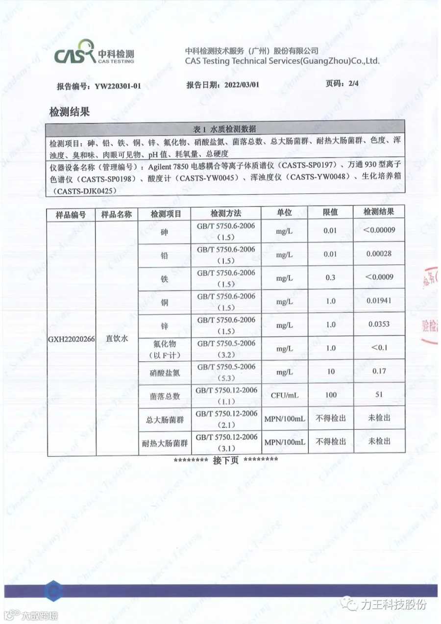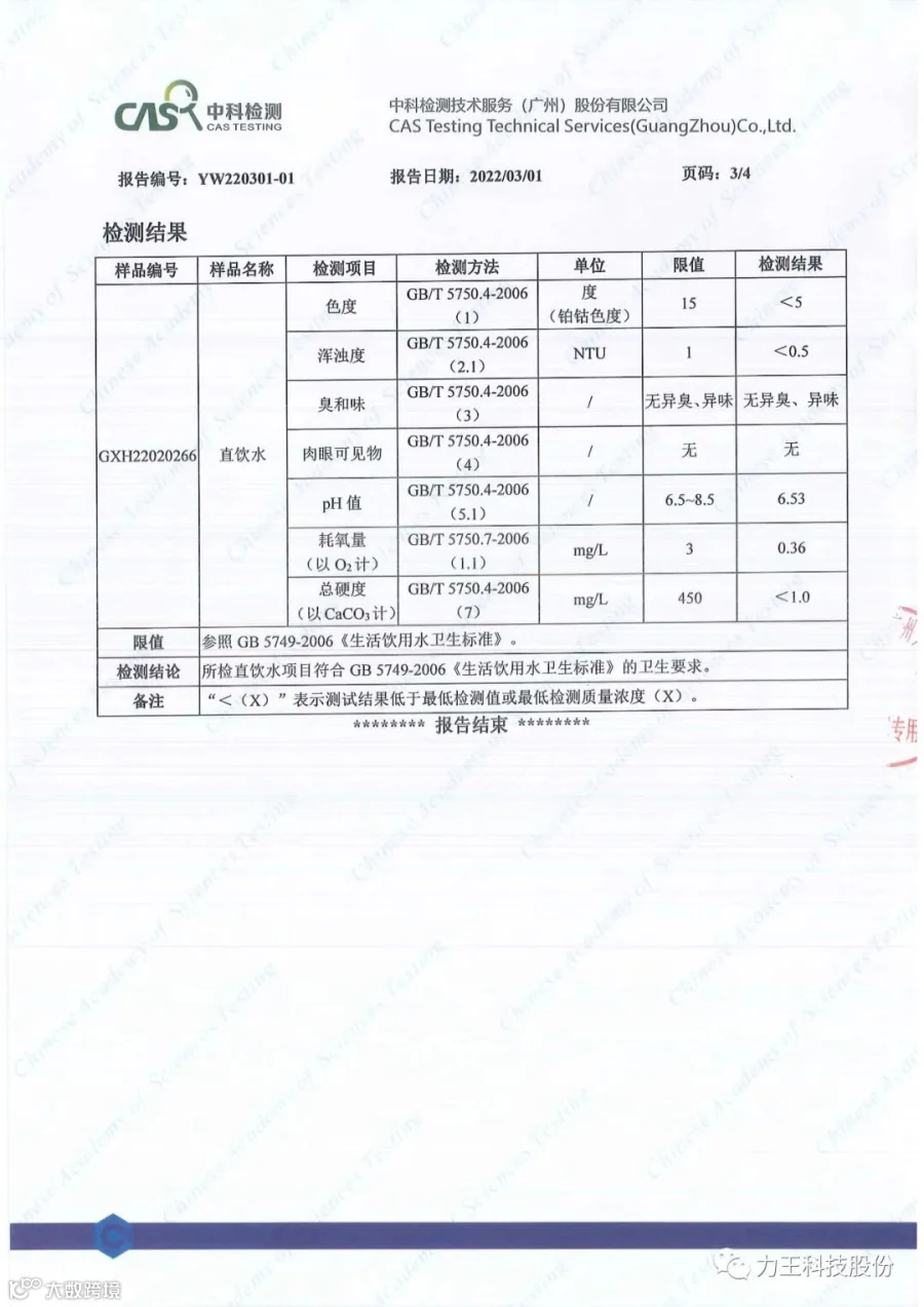受项目组委托,中科检测技术服务(广州)股份有限公司参照 GB 5749-2006 《生活饮用水卫生标准》对佛山市技师学院饮用水进行检测。