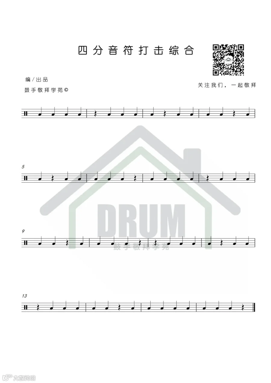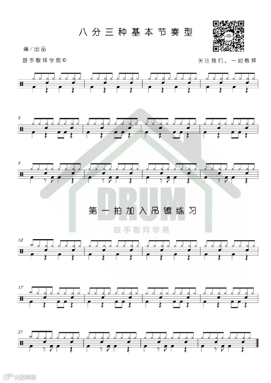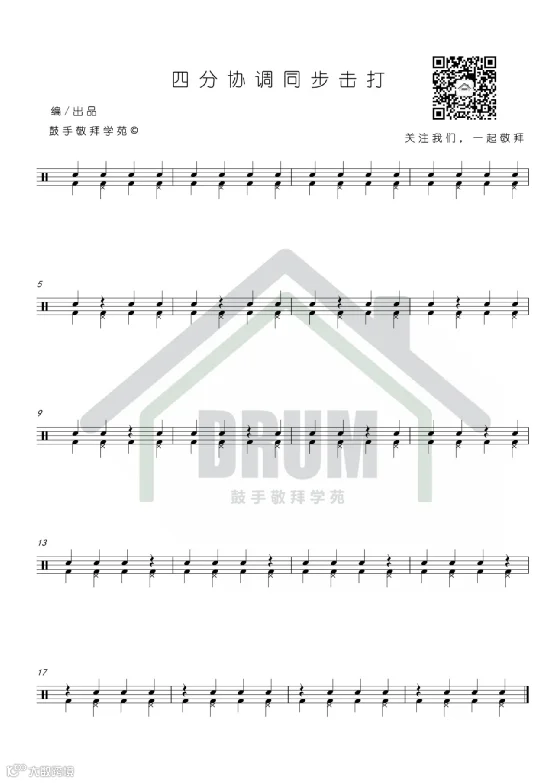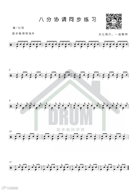 本期练习主要针对我们的同步击打与身体协调,也是鼓手非常重要的素质之一,因为除了线性,你无法做到同步击打(比如踩镲与底鼓)的话,那么你的节奏将会变得很烂了。在练习的过程中,把握感受四肢的协调也是重中之重哦。那么点开视频,一起来学习吧。