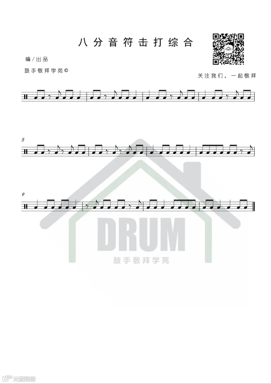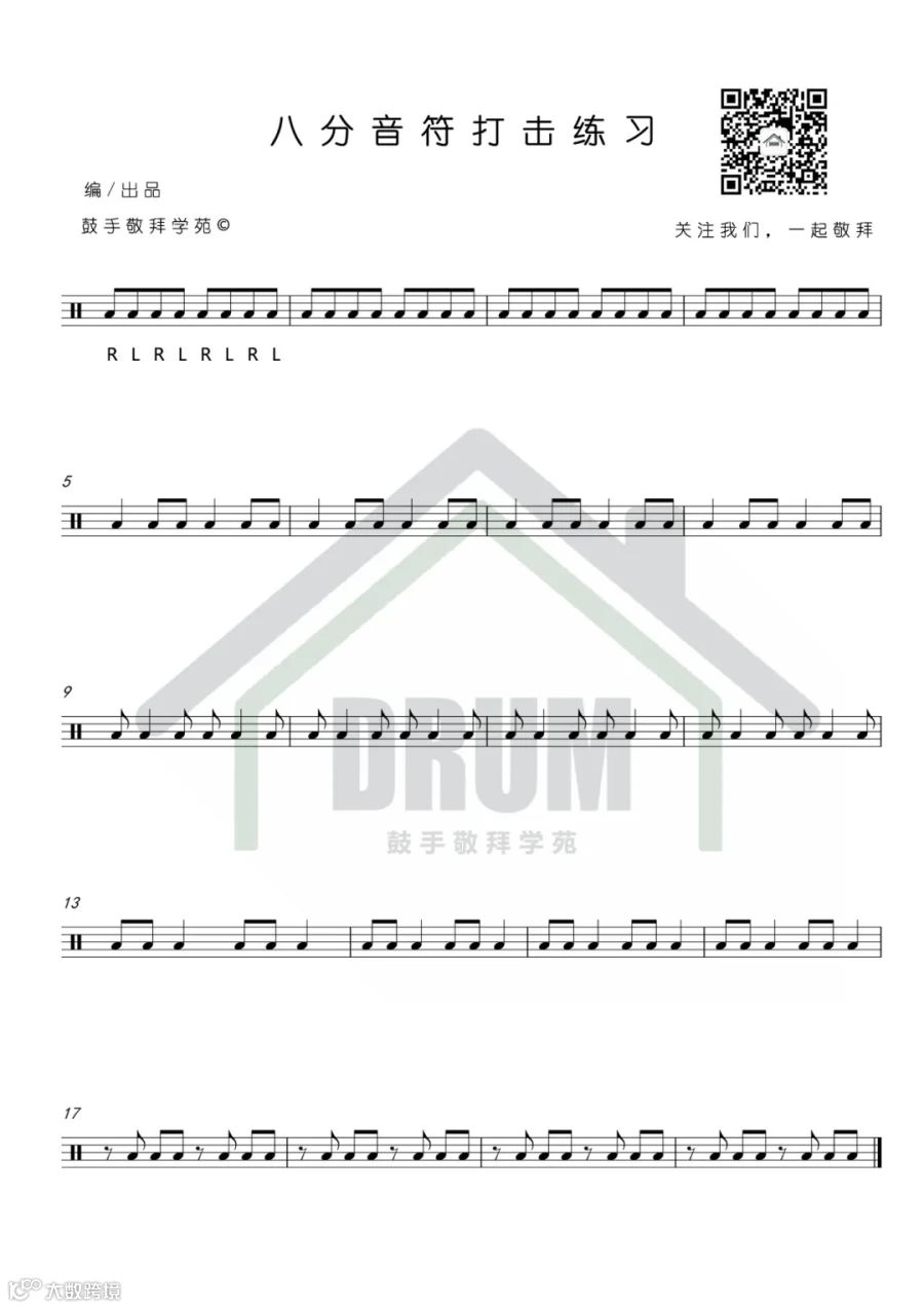 本期主要练习八分音符中不同的组合,和第一期一样,嘴里要数拍子(1234),手臂不可动,以手腕来发力,左脚的后跟要跟着踩(1234),并且每一声的强弱都要均匀,具体示范请点开视频,一起来学习吧