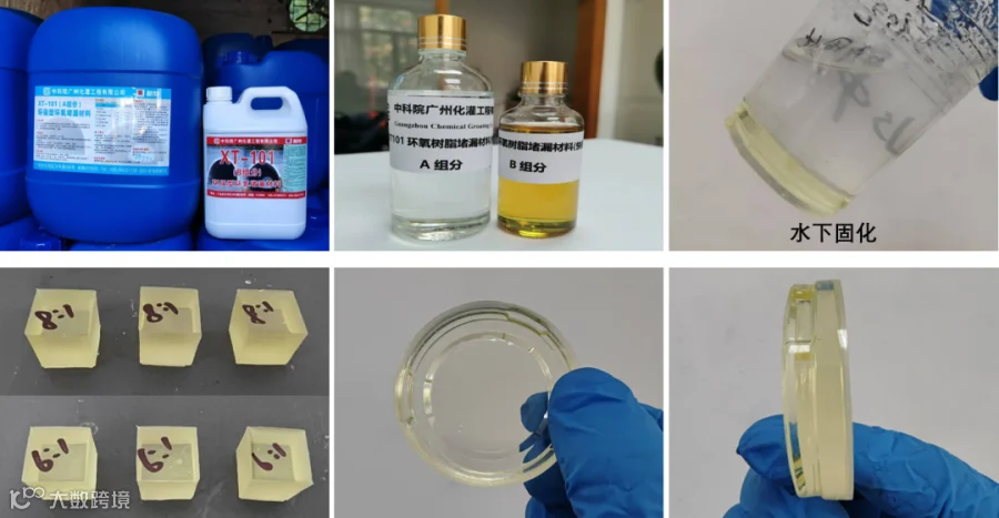 中科院广州化灌工程有限公司出品的XT-101环保型环氧堵漏材料,包含A组分和B组分,是以改性环氧树脂为主剂,采用高活性、酚醛改改性胺为固化剂。材料在有水介质条件下可快速聚合反应,可实现较快速度的堵漏、防渗。